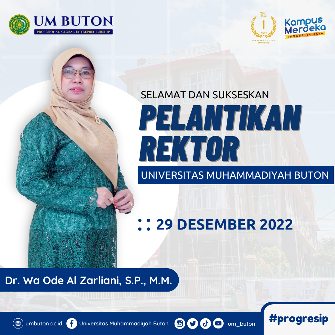 Rektor Universitas Muhammadiyah Buton (UM Buton), Dr. Wa Ode Al Zarliani, S.P., M.M. kembali dilantik sebagai Rektor UM Buton Masa Jabatan 2022-2026 oleh